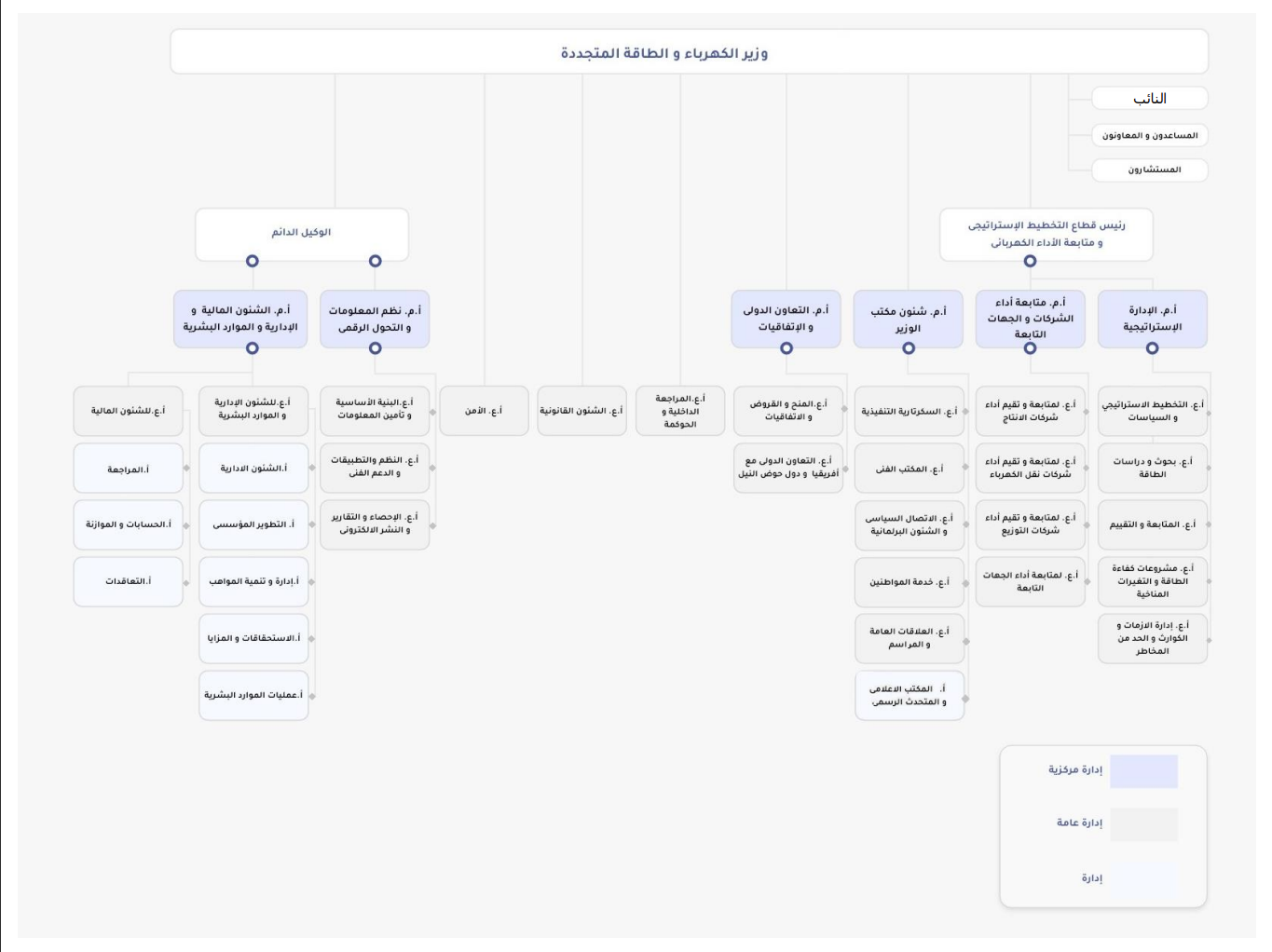 • تهدف وزارة الكهرباء والطاقة المتجددة طبقاً لقانون الكهرباء الجديد إلى وضع السياسات لقطاع الكهرباء لتنفيذ استراتيجية الطاقة الكهربائية متضمنة الخطط والبرامج المتعلقة بالإطار المؤسسي المناسب، وتأمين الإمداد بالطاقة الكهربائية وتشجيع الاستثمار، البحوث والتطوير، ورفع الكفاءة، وحماية المنافسة، والحفاظ على البيئة، وتوثيق التعاون مع الدول الأخرى في مجال الكهرباء.