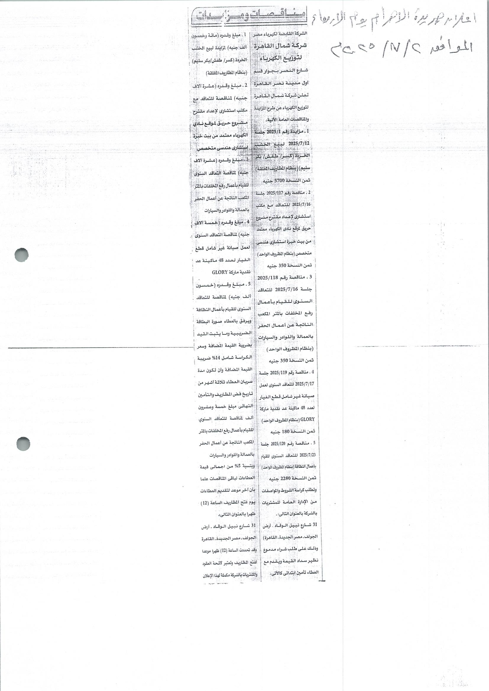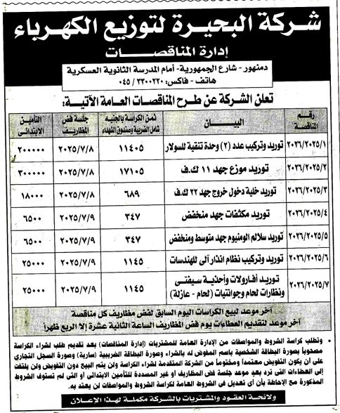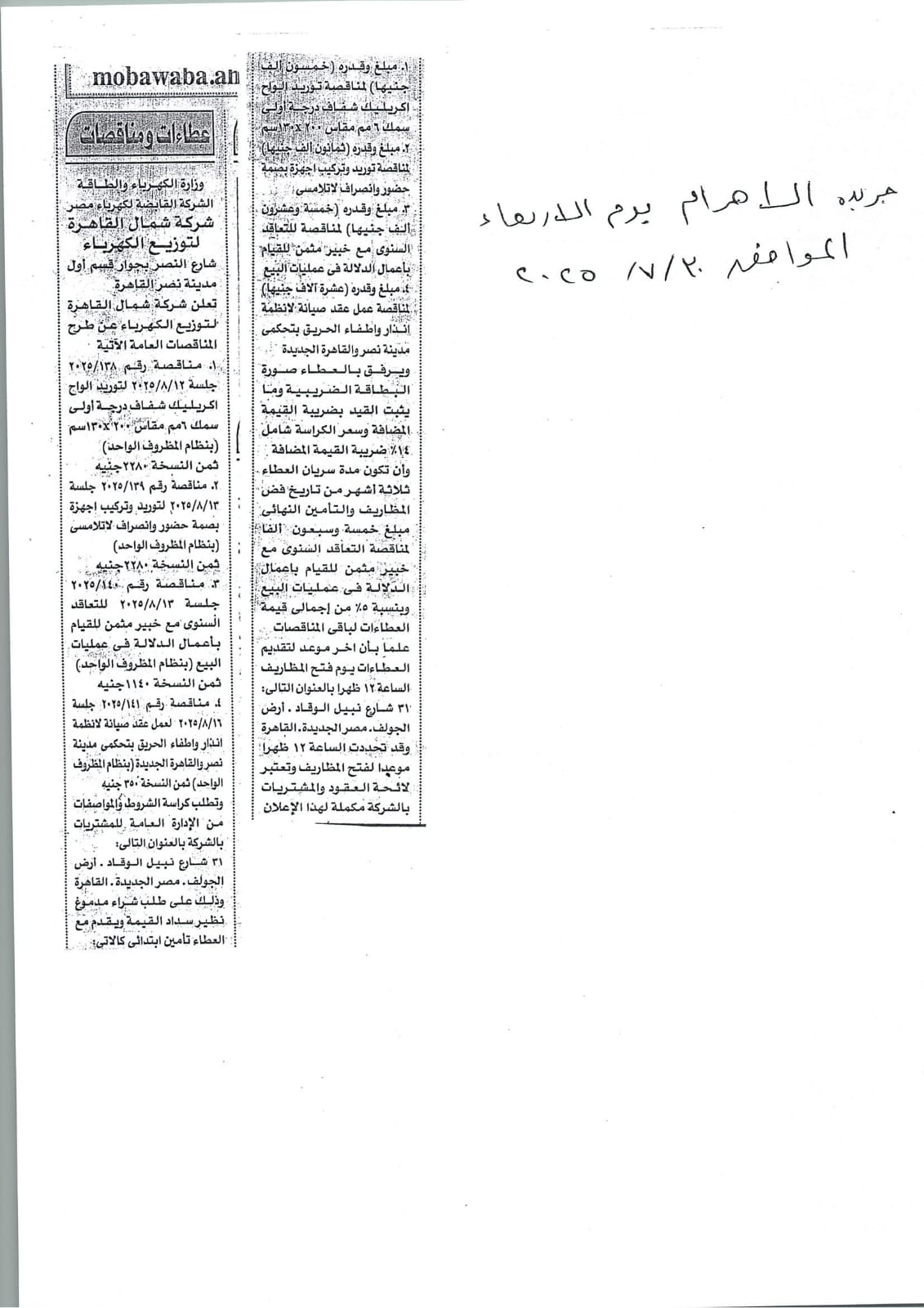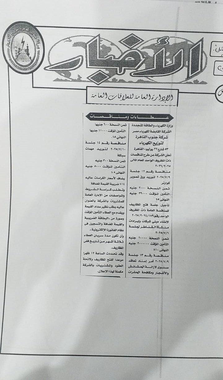 | الشركة القابضة لكهرباء مصر | للتعاقد السنوى للقيام باعمال رفع المخلفات بالمتر المكعب الناتجة عن اعمال الحفر بالعمالة واللوادر والسيارات | 2025/7/16 | 2025/7/2 | 350 | 10000 |  |