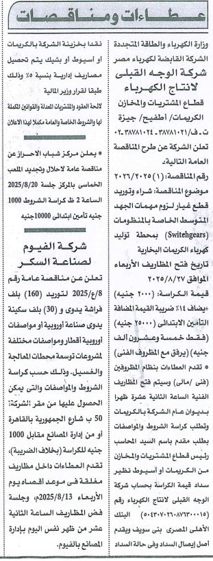 | الشركة القابضة لكهرباء مصر | عملية شراء وتوريد قطع غيار لزوم مهمات الجهد المتوسط الخاصة بالمنظومات ( Switchgears ) بمحطة توليد كهرباء الكريمات البخارية | 2025/8/27 | 2025/7/28 | 2000 جنية مصري | 25000 جنية مصري |  |