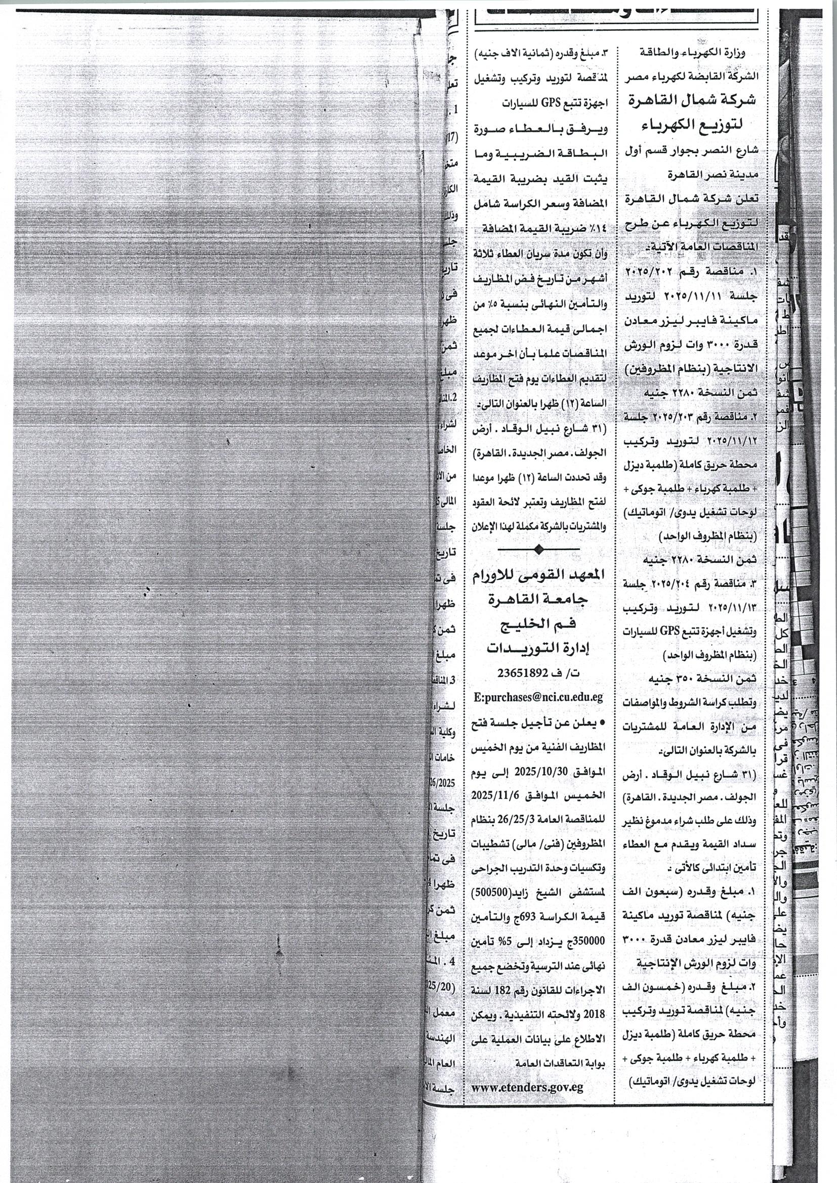| الشركة القابضة لكهرباء مصر | توريد وتركيب وتشغيل جهاز تتبع GPS للسيارات | 2025/11/13 | 2025/10/29 | 350 | 80000 |  |